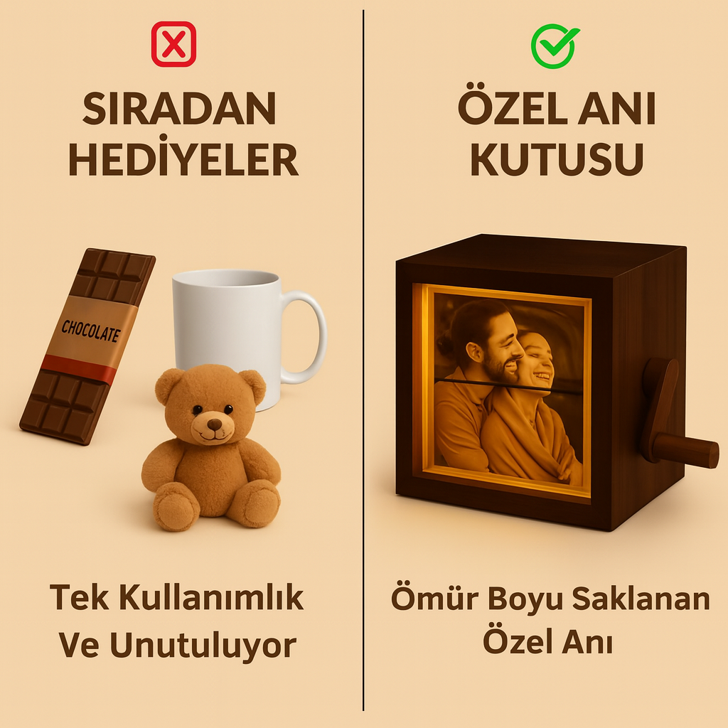 Her kutu, sıradan hediyelerden çok daha fazlasını sunar; içinde sizin hikâyenizi taşır. Premium ahşap malzemeden tamamen el işçiliğiyle üretilen tasarımı, Kişiye özel hazırlanması ve güvenli alışveriş süreci sayesinde, değer verdiğiniz insanlara ömür boyu saklanacak unutulmaz bir an bırakın.